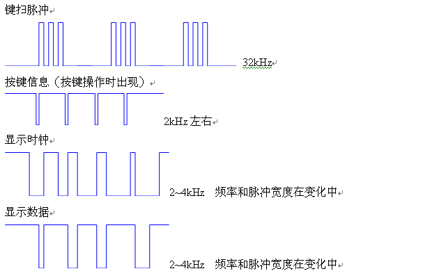 其实,我们所做的,是只管这四路信号的有无,而不管具体内容(也是无法管的)。如键扫脉冲、显示时钟、显示数据,3路信号只要有了一路,说明MCU已经正常工作,这3路信号是主板MCU正常工作的重要标志之一。通常,对于MCU是否已经正常工作,感到不易把握,而此三路信号,恰恰可以非常明确地给出答案。