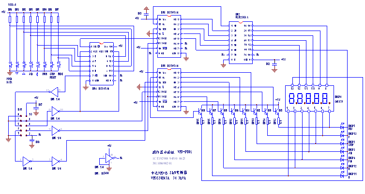 采用5位数码显示器,BU2提供位驱动信号;BQ1~BQ8,提供段驱动信号。位、段驱动信号BU3、BU1(在此称之为数据转换器),进1出8,为串入并出式数据转换电路,为显示器数据解码所专用。